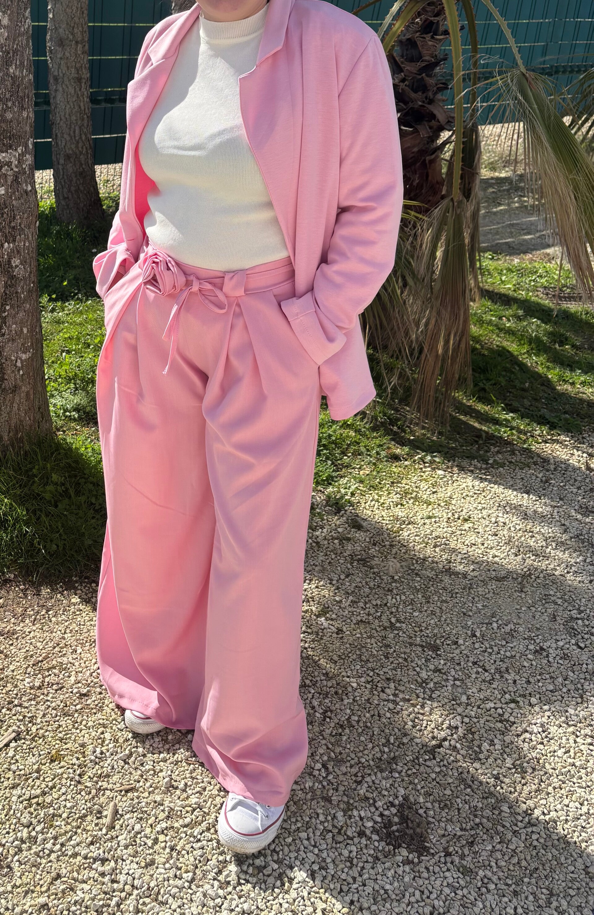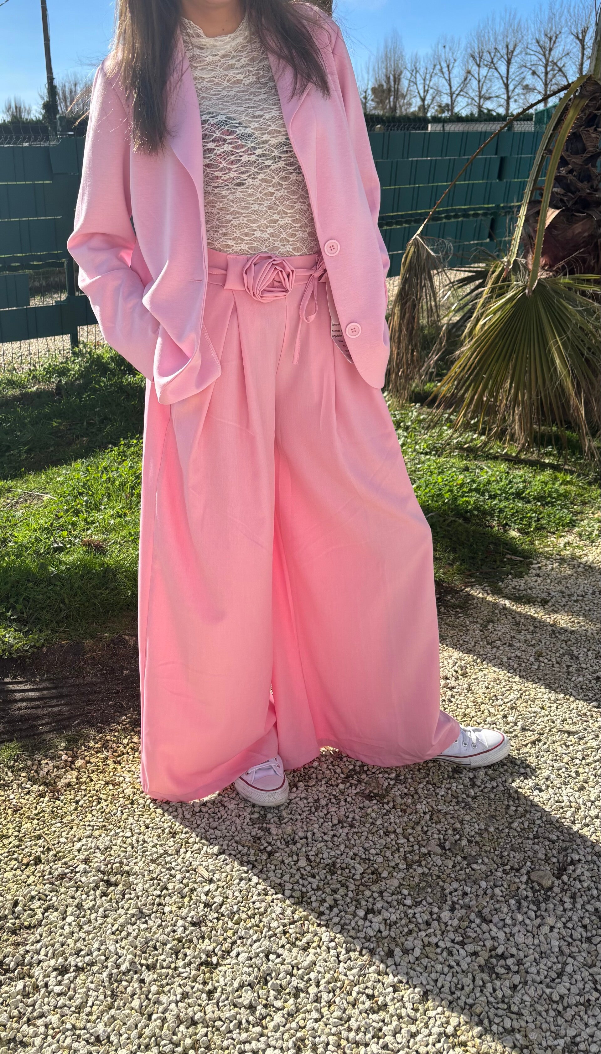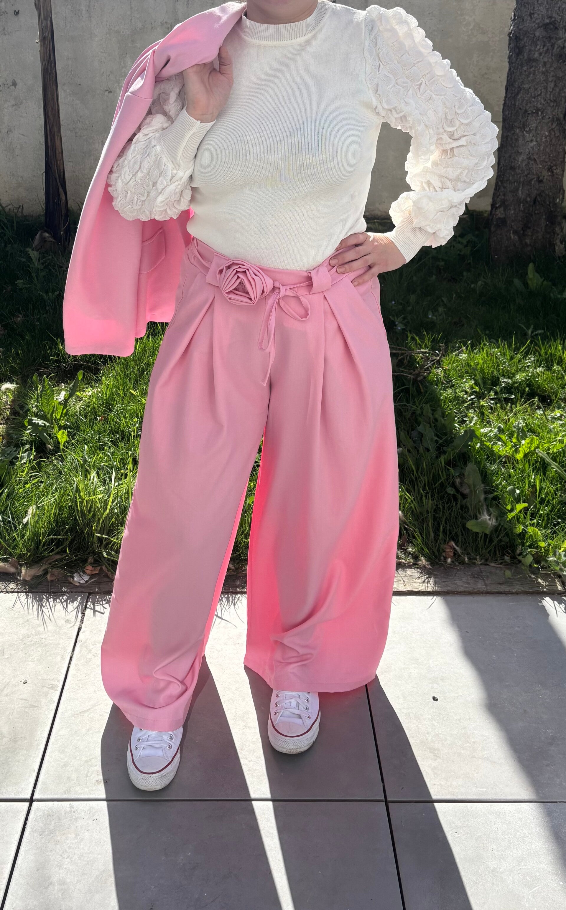 Pantalon large fluide smock taille haute élastique avec une petite rose en détail