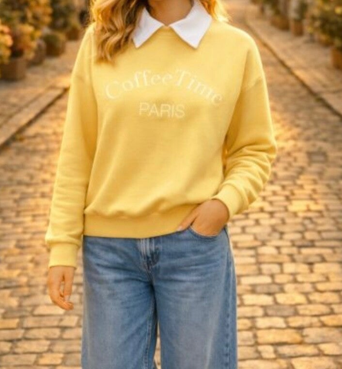 Sweat Coffee Time Jaune col polo léger très agréable à porter parfait pour le printemps