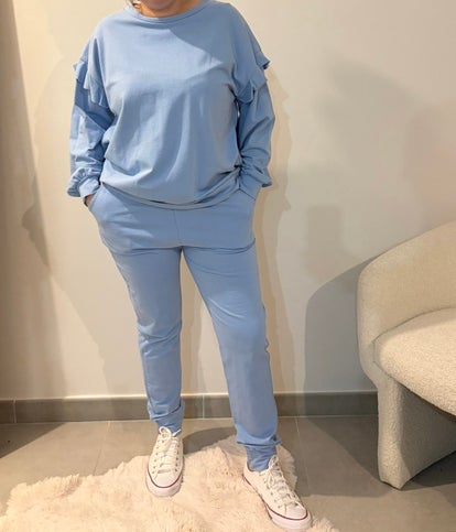 Ensemble Andrea Bleu ciel jogging+ pull à volant sur les manches matières très légères agréable à porter